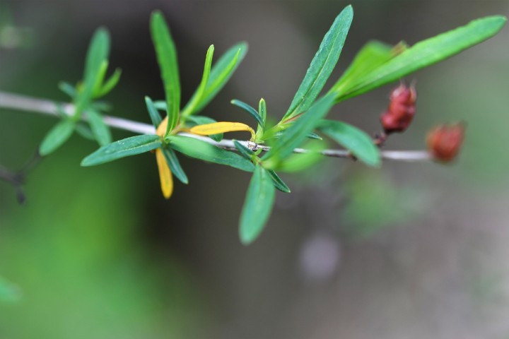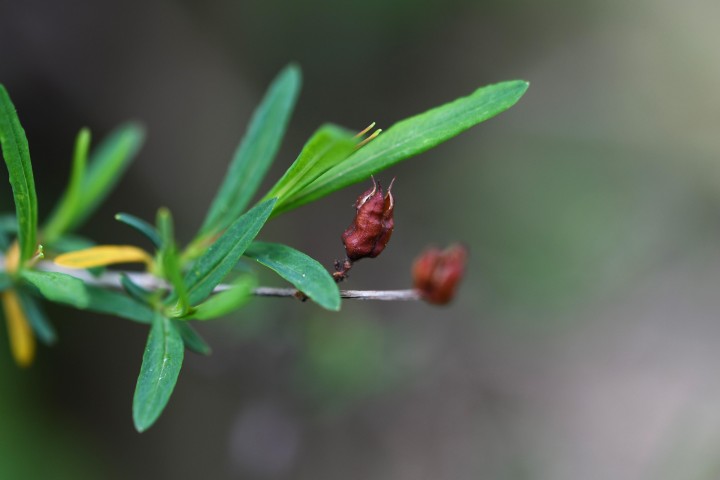 Rýchle rastúci poloker dosahujúci výšky až 60 cm. Stále zelené listy sú úzko eliptické alebo úzko vajcovité, až 10 cm dlhé, celookrajové, na líci matne zelené, na rubu modrozelené, olejnatými žľazami priesvitne bodkované. Kvitne od júla do októbra. Kvety dosahujú v priemere 5–7 cm, jednotlivé, vzácne po 2 až 3, na konci vetvičiek päťpočetné, zlatožlté. Plodom je hruškovitá, 10–14 mm dlhá hnedočervená tobolka.