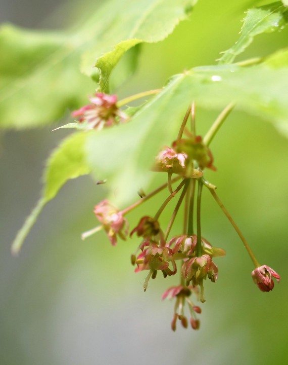 Je to menší stromček alebo krík, v domovine 5-7 m vysoký, husto vetvený, letorasty lysé a červené. Listy obrysom okrúhle alebo takmer okrúhle, 8-14 cm veľké, hlboko 7-11 laločné, laloky oválne, podlhovasto vajcovité až kopijovité, špicaté, dvojito-pílkovité, na jeseň sa listy sfarbujú do karmínovo-červena. Kvety purpurové, 10-15 mm veľké, v dlho stopkatých chocholíkoch, kvitne v apríli až máji. Plody žltkasto zelené, krídla v pravom uhle až horizontálne roztvorené nažky 25-28 mm dlhé.
