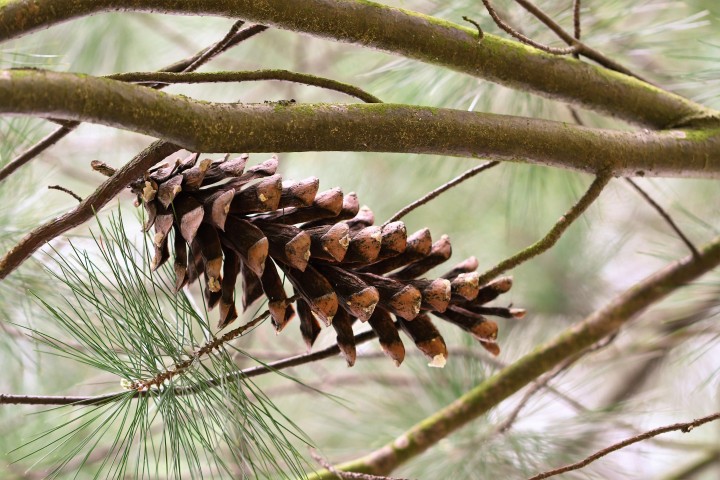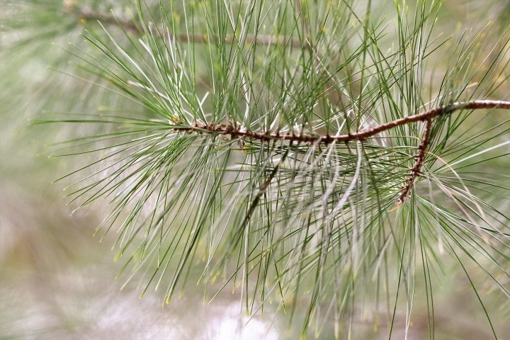 Vysoký strom, ktorý dorastá do výšky 24 - 30(48) m (max. až 67 m), v Európe len 25 - 35(42) m. Ihlice sú vo zväzočkoch po 5. Koruna je v mladosti kužeľovitá, neskôr rozložitá. Kmeň má rovný, s borkou v mladosti dosť tenkou a hladkou, neskôr hrubšou, pozdĺžne ryhovanou. Koreňový systém má obvykle zakrpatený, hlavný koreň nahrádza 3-5 veľkých koreňov, smerujúcich nadol a na boky. Dožíva sa 200 - 450 rokov.