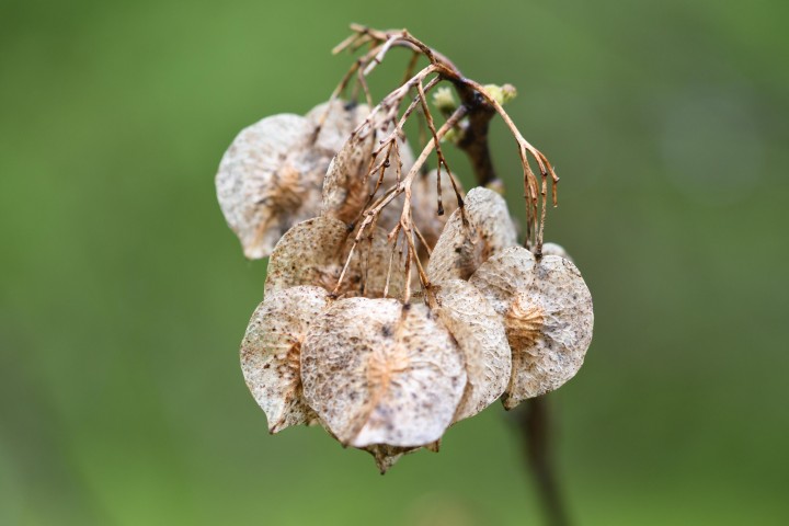 Opadavý ker 6-8 m vysoký, bohato rozvetvený. Borka je tmavo červenohnedá. Listy sú striedavé, stopkaté, 3četné, lístky sú podlhovasto elipsovité až úzko vajcovité, 3-10 cm dlhé, celistvé alebo nadrobno vrúbkované. Kvety sú drobné, združené v chocholíkoch, 4-5četné, zelenobiele. Kvitne od mája do júna.Plodom je nažka so širokým okrúhlym lemom, dosahujúci 15-25 mm v priemere.