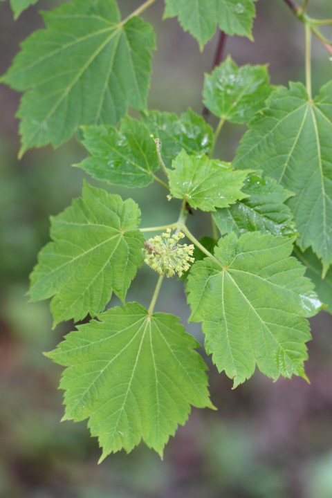 Listy sú 5 až 7 laločnaté so zvlnenou spodnou stranou a odrastajú na atraktívnych červených stonkách, ktoré zvyšujú celoročný záujem, najmä v zime. Unikátne kvety rastú zvisle na konári.